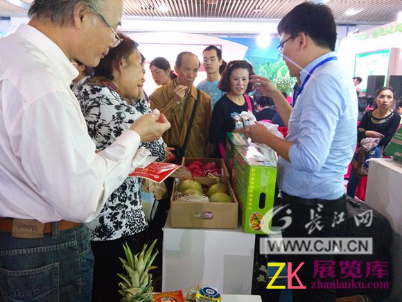 除了湖北本地特产外,二楼云集了海南、新疆、西藏等地的美味农产品,规模最大的是海南展区,热带水果、椰子奶、椰子糖等撩拨着吃货们的味蕾。海 南展区还在当天上午举办了特色农产品专场推介会,最终收获颇丰,海南瓜果蔬菜共计214700吨,签约金额4.7亿元,文昌鸡1500万只,签约金额 8000万元。此外,在二楼展区,藏核桃、德堂糌粑、西藏原生态蜂蜜等多种西藏雪域优质农产品以及新疆红提葡萄、酱用番茄、等20多个有机品牌皆悉数亮 相。长江网记者看到,二楼西面的一个新疆展区被市民团团围住,市民们都在争相尝着“肉虫子”,展区工作人员介绍,这种黄粉虫蛋白含量在70%以上,可以油 炸、炒菜做汤,鲜香入口且能调节人体生理机能,因此很受市民欢迎。
