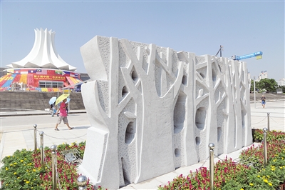 位于中轴线最上方,以一个斜坡形式呈现,墙体上方立着刻有“中国—东盟博览会会址”的石碑,石碑长12米,选用优质芝麻灰石材,采用简练大气的设计方式,正面将东盟博览会会址文字刻于其上,背面用中英文篆刻博览会形成过程和10届以来的辉煌成就。墙面正中央刻有博览会会徽,四周是中国和东盟10国文字的雕刻,体现了东盟元素,代表着中国和东盟10国在博览会中紧密联系在一起,形成一衣带水、不断繁荣的大团体。石碑下侧会冒水,水从上而下,漫过墙体,形成水景关系,是整个景观建设的核心。(黄颖 张丽颜 许恩 赖有光)