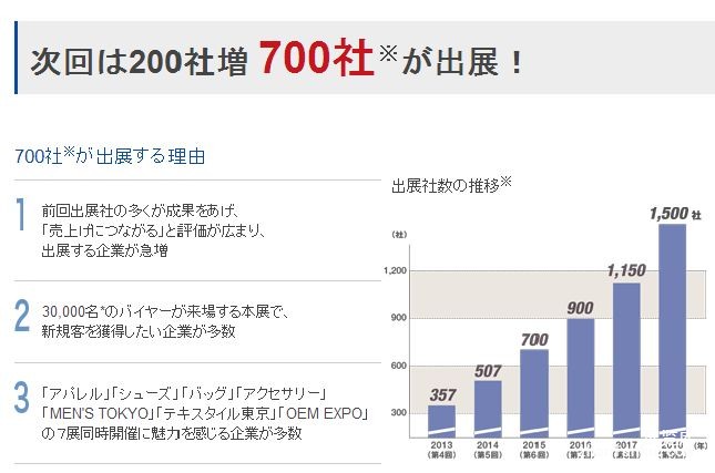 2015春季东京鞋展,共有来自30多个国家和地区的850多家企业参展,到会专业买家97,302人。下届展会将于2015年9月30日-10月2日在Tokyo Big Sight继续盛大召开,为来自世界各地的参展商提供展示新品的机会与平台,为展商开拓业务、发现商机,为其最大限度提高渠道效益,加快买家、进口商和批发商、代理商的销售进程。组委会将扩大展会规模,预计将有超过950家企业参展,将吸引超过45,000人次的专业客商到场参观采购。