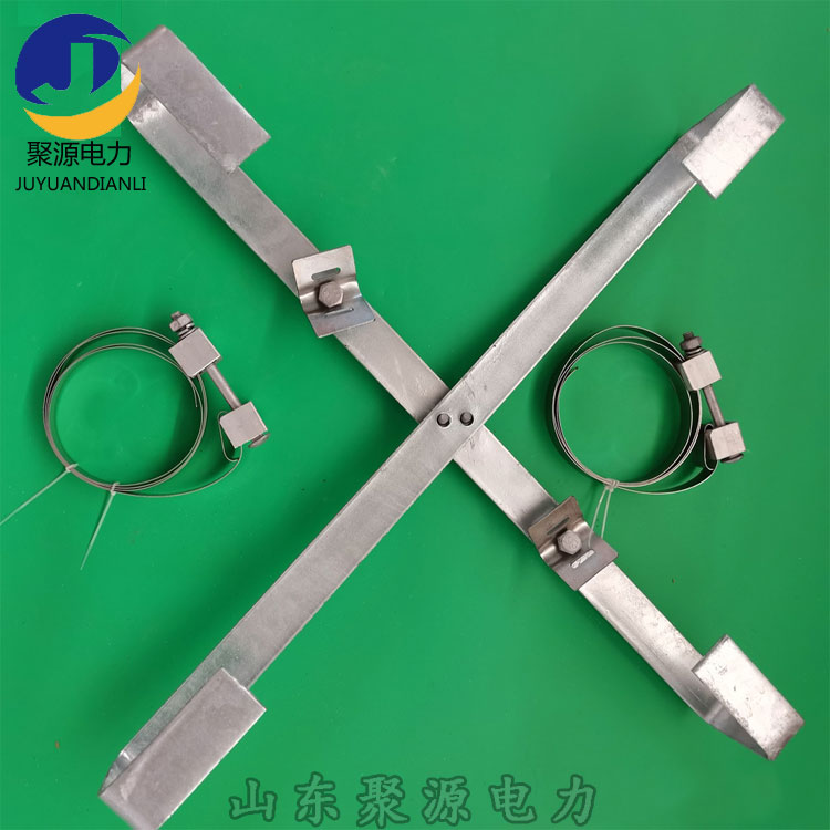 3、用钢带抱箍缠绕电杆,并用螺栓将余缆架紧固到钢带抱箍上,注意钢带要叠压,防止滑脱。