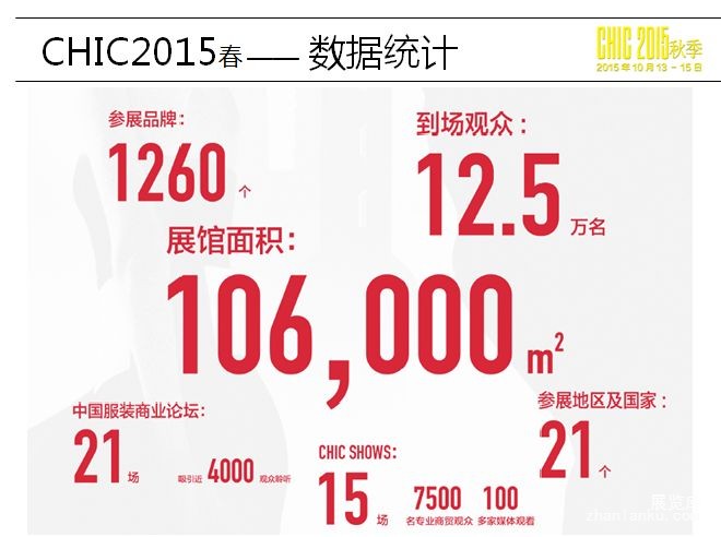 第23届中国国际服装服饰博览会(CHIC)已于2015年3月20日圆满落幕。展会10万平米汇聚了9万多名专业观众,共有来自20个国家和地区的1000余个服装服饰品牌参展,吸引了300家媒体、700名记者现场报道。中国国际服装服饰博览会(CHIC)创办于1993年,作为亚洲地区最具规模与影响力的服装专业品牌展览会,已辉煌走过了23年的岁月,伴随着中国服装产业的发展而不断壮大。目前博览会每届展出面积达10万平方米,汇聚了来自20多个国家和地区的参展商及千余个品牌。中国国际服装服饰博览会(CHIC),不仅成为亚洲地区最具规模的服装专业贸易展,同时也成为中国服装业界公认的年度盛会,已被业届公认为是服装品牌推广、市场开拓、创新展现、潮流发布、财富创造、商贸洽谈、资源分享及国际交流的最佳平台。